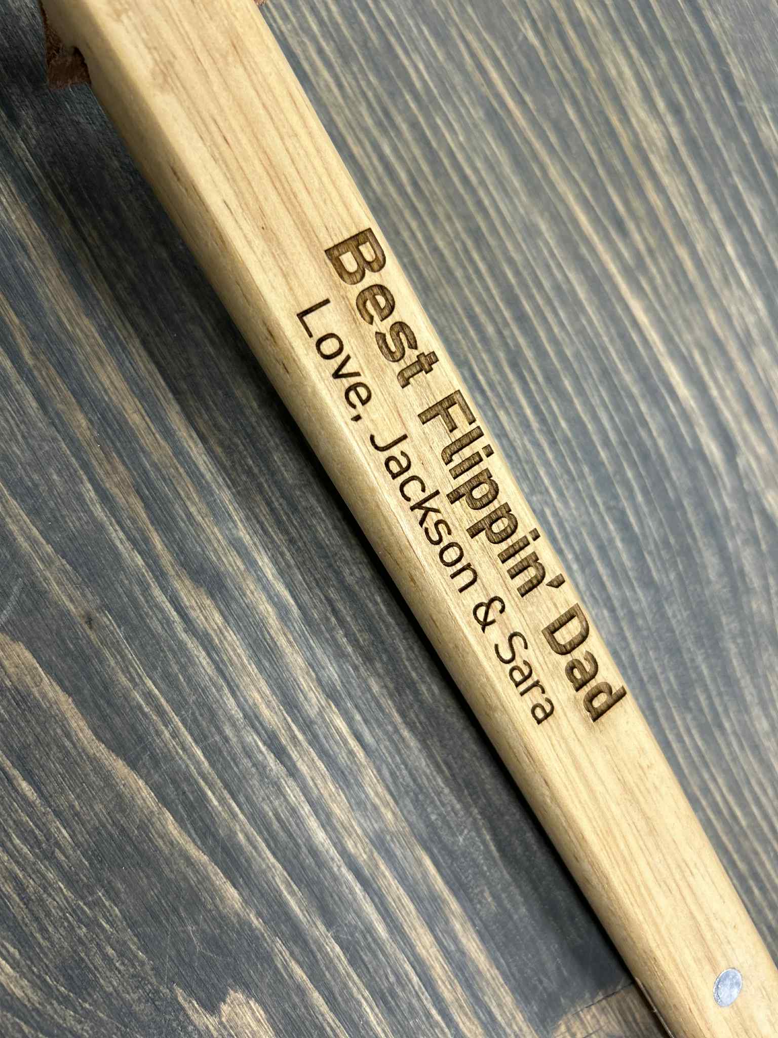 Whether it's for flipping burgers, turning steaks, or adding a little flair to backyard cookouts, this durable grilling tool is built to last through countless BBQ seasons. The sturdy wood handle offers a rustic charm while the custom engraving makes it a keepsake to be treasured.